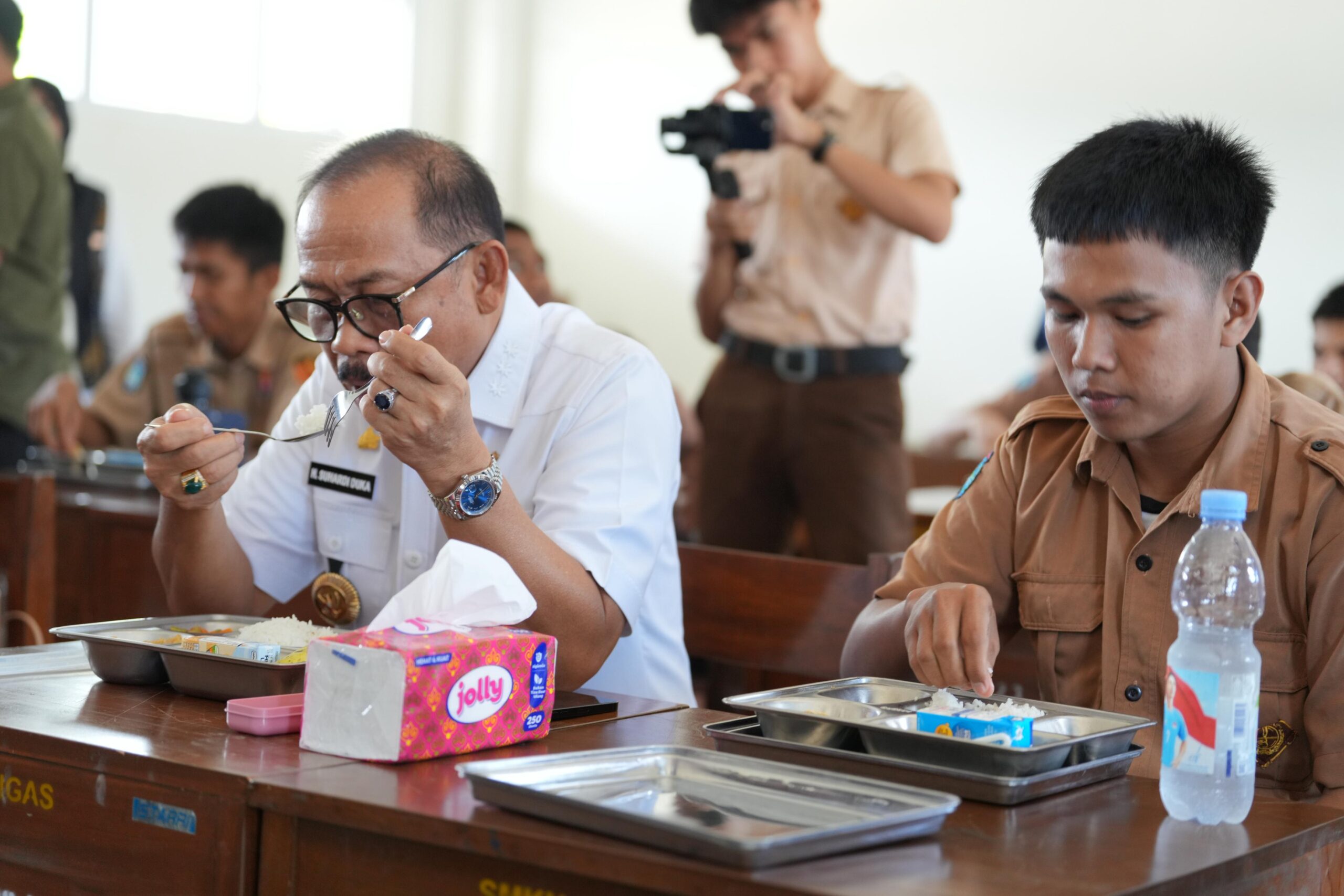 Dalam kesempatan tersebut, Gubernur bahkan mencicipi langsung makanan MBG untuk memastikan kualitas dan kebersihannya bersama para siswa.