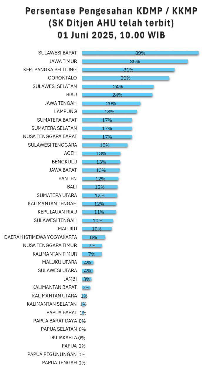 Mamuju,Sulbarpost.com – Direktorat Jenderal Administrasi Hukum umum (Ditjen AHU) Merilis data terkini sekira pukul 10.00 WIB, Minggu, 1 Juni 2025. Persentase pengesahan Koperasi Desa Kelurahan Merah Putih (KDMP) dan Koperasi Kelurahan Merah Putih (KKMP) menempatkan Provinsi Sulawesi Barat di peringkat pertama capaian pembentukan dan pengesahan Koperasi Desa Kelurahan Merah Putih.
